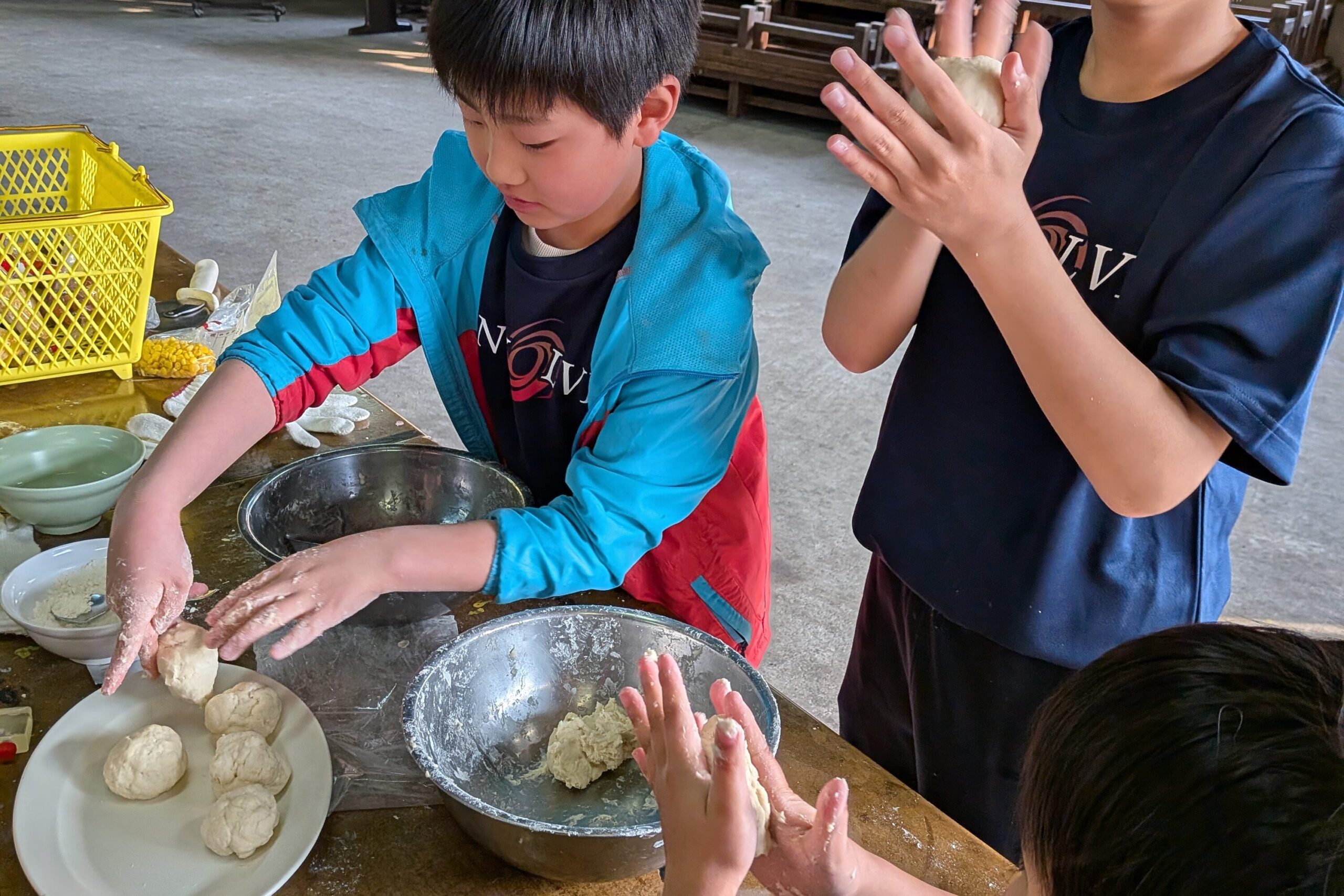 生地づくりでは、柔らかさは耳たぶくらいを目安にしながら、「これくらい?」「もういい?」とお互いに確認し合いながら取り組みました、もちもちの生地が完成しました!