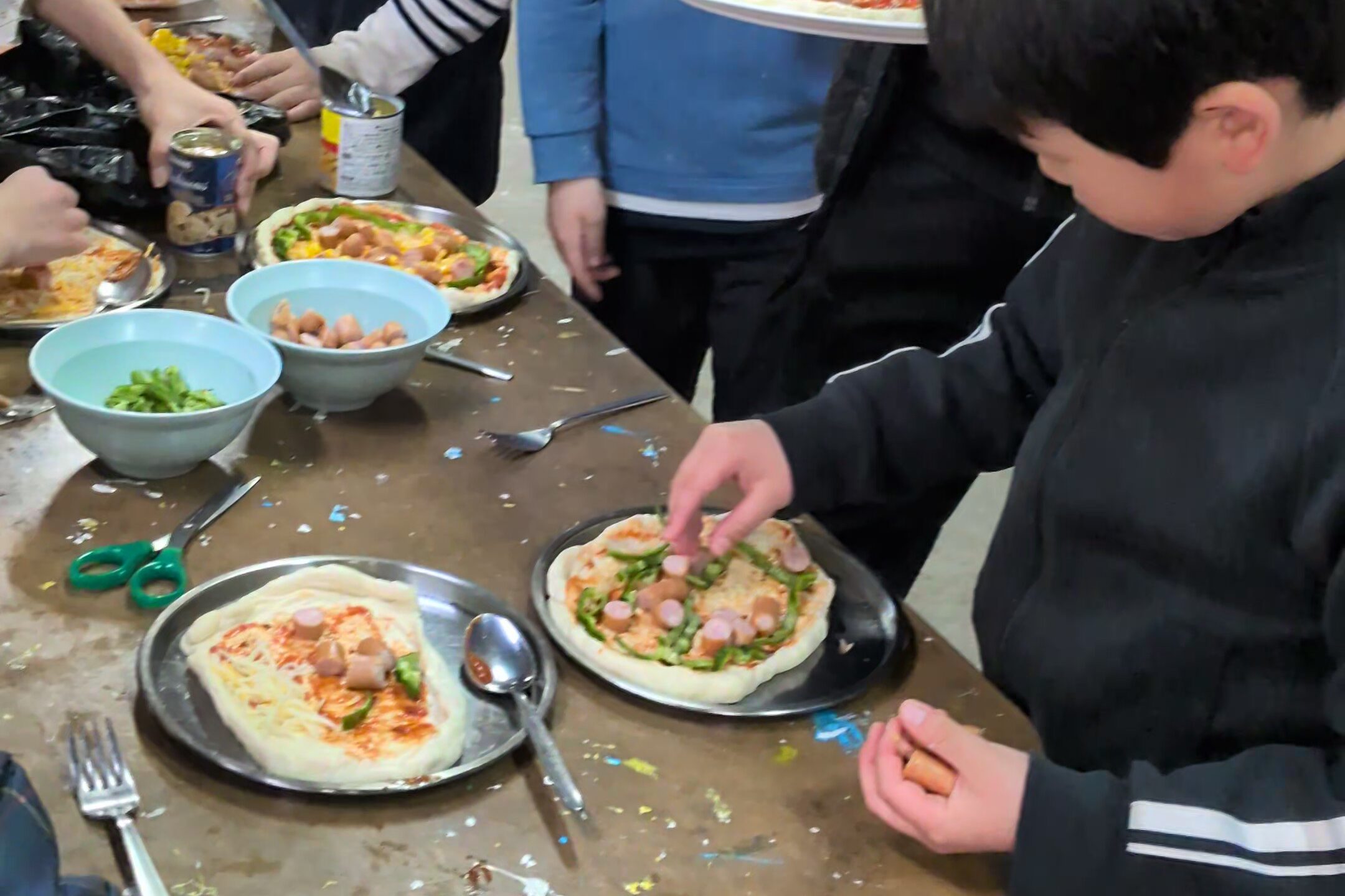 トッピングではピーマンやウインナーも自分たちでカットしました。